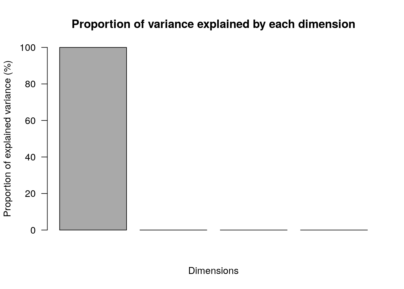 barplot(proportion_eig, las=1, ylim=c(0,100), xlab="Dimensions", ylab="Proportion of explained variance (%)",